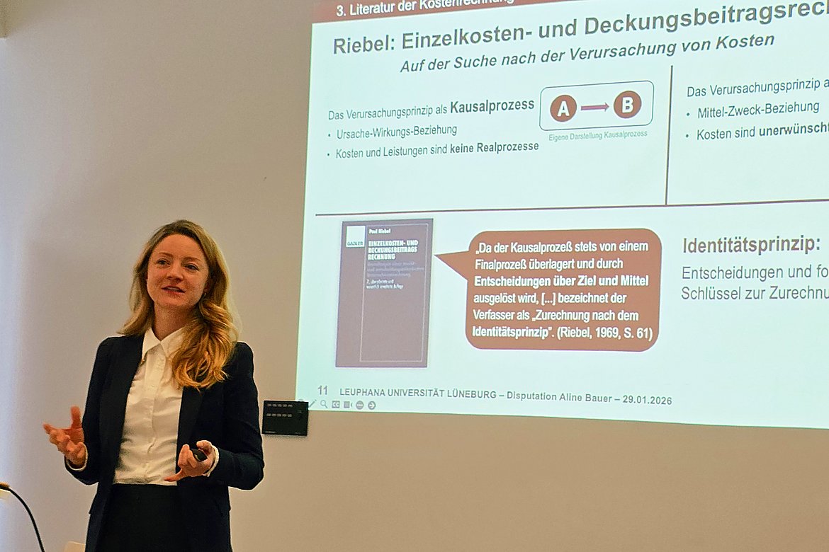 Aline Bauer (geb. Hendrich) hat an der Universität Lüneburg erfolgreich ihre Dissertation verteidigt und erhält die Gesamtnote „sehr gut“ (Magna Cum Laude). In ihrer Doktorarbeit entwarf sie die konzeptionelle Weiterentwicklung des Material Flow Cost Accountings (MFCA), basierend auf den Theorien der deutschen Kostenrechner-Koryphäen Wolfgang Kilger und Paul Riebel. Mit einem szenario-basierten Ansatz wird Riebels Identitätsprinzip innerhalb der Kostenrechnung nun erfüllt und MFCA zu einem entscheidungsorientierten Instrument in der Umweltkostenrechnung erweitert. Wie Aline Bauer in ihrer Disputation erläuterte, fehlte im klassischen MFCA nach ISO 14051 bislang ein wichtiges Element im Plan-Do-Check-Act-Zyklus - nämlich die Bewertung von Maßnahmen unter Kosten- und Klimaschutzaspekten.