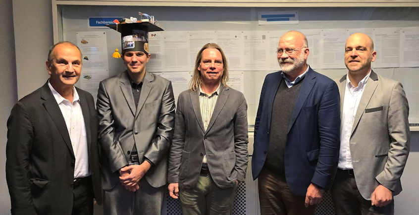 Doktorand Benjamin Fritz (2.v.l.) mit seinen Prüfern, den Professoren Mario Schmidt, Jochen Kolb, Christoph Hilgers und Tobias Viere (v.l.n.r.).
