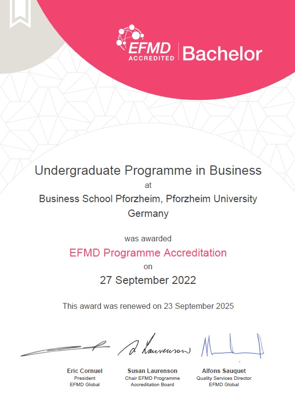 - The Business School Pforzheim has been awarded the EFMD accredited seal for all Bachelor of Science programs, thus covering the 13 programs in Business Administration.