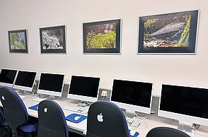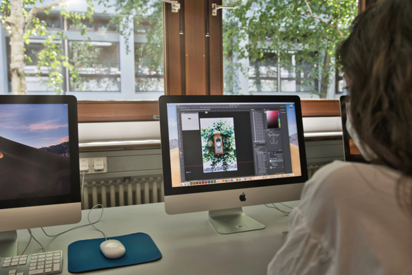 20 Computerarbeitsplätze, ausgestattet mit Layout und Bildbearbeitungssoftware (Adobe Indesign, Illustrator, Photoshop, Bridge u. Acrobat), Microsoft Office, SPSS, Keynote, Numbers, Pages, Flachbettscanner
