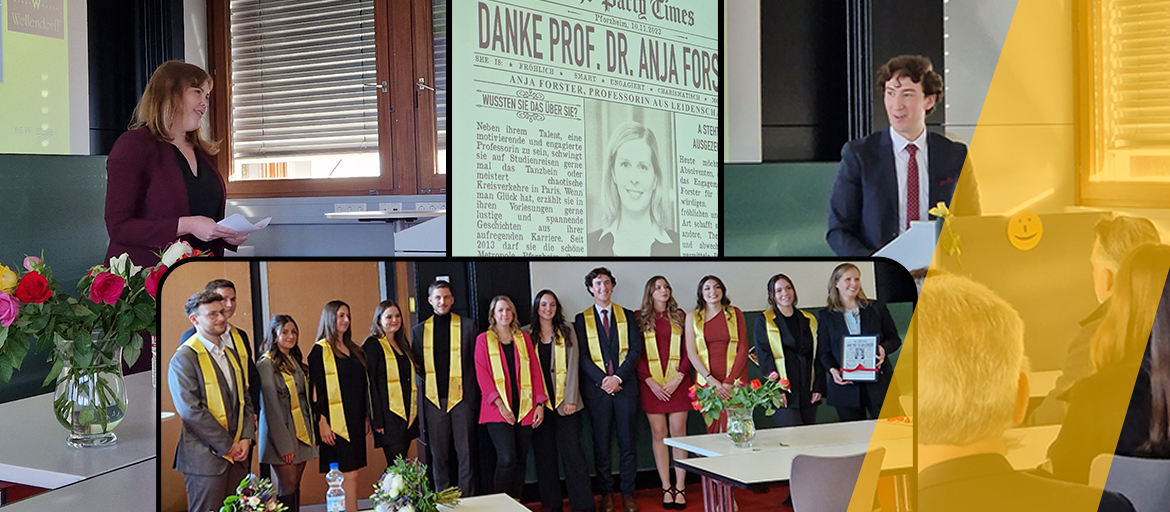 Höhepunkte der Veranstaltung waren einerseits die inspirierende Rede des Absolventen Henri Korsh über seine Studienerfahrungen sowie andererseits die motivierende Ansprache einer Ehemaligen des Studiengangs, Frau Chantal Kaucher (heute tätig im Marketing bei Wellendorff). Die abschließende Überreichung der Abschlussurkunden und Schärpen markierte letztlich nicht nur das Ende eines wichtigen Kapitels, das Ende des Studiums der Absolvent*innen, sondern auch den Anfang neuer (beruflicher oder akademischer) Wege.