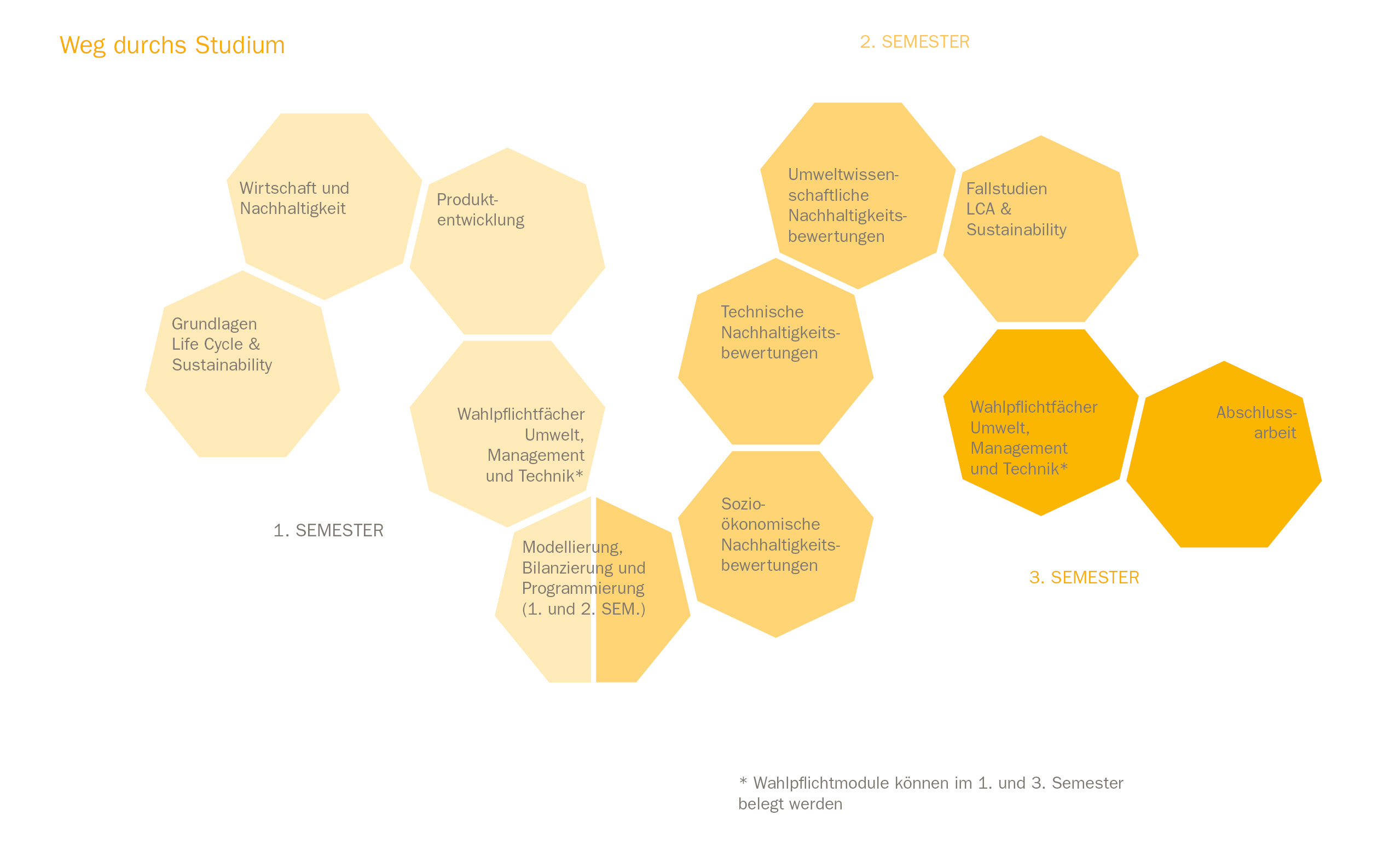 Die Schwerpunkte des Masterstudiengangs liegen auf der praktischen Anwendung der Methodenkompetenz im Bereich Life Cycle Assessment und produktions- und produktbezogener Material- und Energieflussanalysen. Sie lernen mit den dafür notwendigen und in der Praxis verbreiteten Standards, Methoden, Datenbanken, Softwaretools und wissenschaftlichen Konzepten umzugehen und diese mit wirtschafts- und ingenieurwissenschaftlichen Fragestellungen zu verknüpfen.